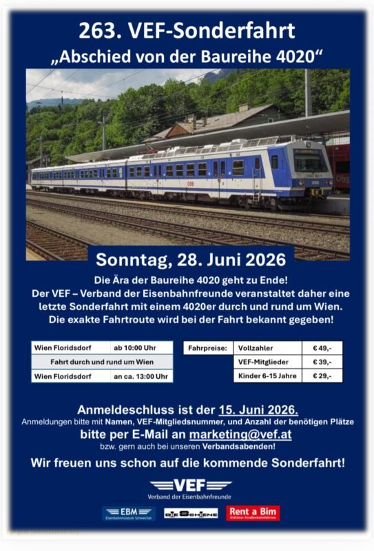 Asociația Pasionaților de Căi Ferate VEF anunță organizarea unei călătorii speciale dedicate seriei ÖBB 4020, trenurile emblematice ale transportului suburban vienez, aflate aproape de retragerea completă după aproape cinci decenii de serviciu. Evenimentul, programat pentru duminică, 28 iunie 2026, marchează simbolic sfârșitul unei ere pentru una dintre cele mai cunoscute și îndrăgite serii de automotoare din Austria.